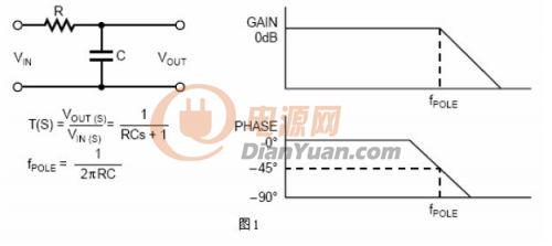 數學上,在傳輸方程式中,當分母為零時會產生一個極點。在圖形上,當增益以20dB每十倍頻的斜率開始遞減時,在博得圖上會產生一個極點。圖1舉例說明一個低通濾波器通常在系統中產生一個極點。其傳輸函數和博得圖也一并給出。