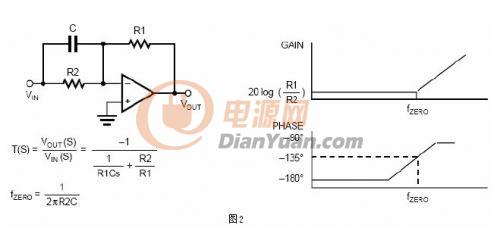 零點是頻域范圍內的傳輸函數當分子等于零時產生的。在博得圖中,零點發生在增益以20dB每十倍頻的斜率開始遞增的點,并伴隨有90度的相位超前。圖2描述一個由高通濾波器電路引起的零點。