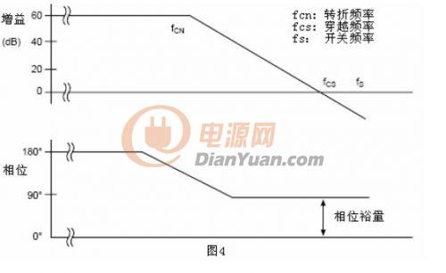 增益帶寬是指單位增益時的頻率,見圖4,增益帶寬就是穿越頻率Fcs。最大穿越頻率的主要限制因素是電源的開關頻率。根據采樣定理,如果采樣頻率小于2倍信號頻率(更嚴謹一點的說法是應該小于2倍最大信號頻率,譯注),則被采樣的信息就不能被完全讀取。