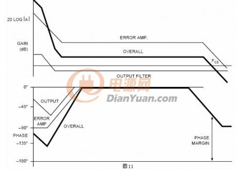因為這是一個線性系統,可以用疊加的方法得到整個系統的傳輸函數。通過把整個環路各部分的增益和相位疊加起來,產生整個系統的博得圖。通過放置補償網絡的極點和零點使系統的性能最優化。圖11把各部分的博得圖結合起來,負反饋系統的180度相移也加入進來了。