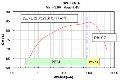 DC-DC轉換器的電源轉換效率和功率電感性能之間的關聯如圖3所示。PFM是指手機在待機狀態下保持低電流負荷的模式,這時電源轉換效率性能是與功率電感的Rac(交流電阻)以及電流-感值偏執特性相關。圖4當中顯示了各功率電感的Rac特性以及圖5中開關頻率數是4MHz的DC-DC轉換器IC的電源轉換效率特性。