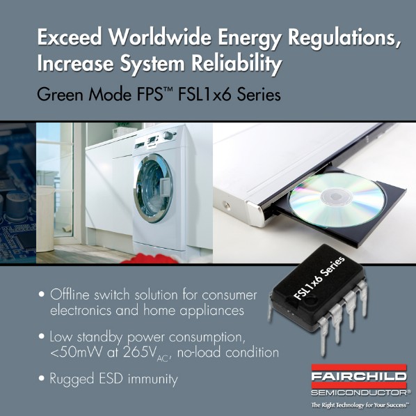 飛兆半導體公司 (Fairchild Semiconductor)近期開發出FSL1x6 系列綠色模式飛兆功率開關 (FPS)器件,這些集成式PWM控制器帶有專有的綠色模式功能,提供了先進的間歇模式控制,并在間歇模式下關閉部分功能模塊減小控制器自身操作電流,從而最大限度地降低待機功耗。