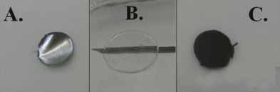 從左至右依次為:(A)鋅陽極(直徑1厘米),(B)EMIHSO4-聚乙烯醇隔膜(置于一個注射器針頭上,顯示厚度和透明度),(C)二氧化鉛-碳陰極。