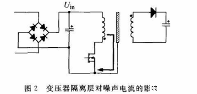 圖l中的共模電流, 在電路中的耦合途徑主要有3條:從噪聲源—— 功率開關管的d極通過C耦合到地;從噪聲源通過c。 耦合到變壓器次級電路,再通過C 耦合到地;從變壓器的前、次級線圈通過C?C 耦合到變壓器磁芯,再通過C 耦合到地。這3種電流是構成共模噪聲電流(圖1中的黑色箭頭所示)的主要因素。共模電流通過電源線輸入端的地線回流,從而被LISN取樣測量得到。