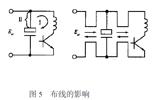 流過(guò)開關(guān)大電流的導(dǎo)線應(yīng)盡量短,并且不跟其它線交連。降壓型開關(guān)穩(wěn)壓電源的續(xù)流二極管或者升壓型的開關(guān)三極管的接地端應(yīng)以最短的引線直接與輸出電容的地端相連。圖5表示了布線的影響,尖峰干擾通過(guò)環(huán)路I輻射,故構(gòu)成這一環(huán)路的各段連線的感性耦合必須最小,電容器的引線要短,以減小引線電感。