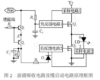 3)采用功率器件(MOS管)開通或關斷來強制吸收或隔離浪涌,防止浪涌對半導體激光器損壞。
