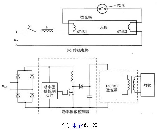 我們知道,最普通的熒光燈的起輝是采用一個串聯(lián)的鐵芯電感和一個并聯(lián)的起輝器(圖3a)。對于這種電路在用LED日光燈直接替換時,只要拔掉起輝器就可以了。但是由于鐵芯電感仍然串聯(lián)在電路中,所以它仍然帶來將近6.4W(Philip)到10W(國產)的損耗,結果由于這部分的額外損耗就大大降低了LED的節(jié)電功效。