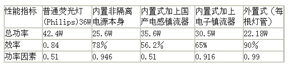 也就是說,直接替換的結果是效率大大降低,對于國產電感鎮(zhèn)流器,效率只有56.2%。只比普通熒光燈節(jié)電6.8W。