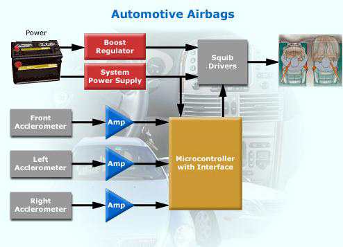 即使是小型的汽車目前都設有6個氣囊,而且所采用的安全標準要求極高。負責為氣囊充氣的是一款稱為爆管驅動器(squib driver)的特別芯片,該芯片必須能夠在撞車的緊急關頭立即啟動。按照圖1所示,氣囊系統(tǒng)由多個部分組成。