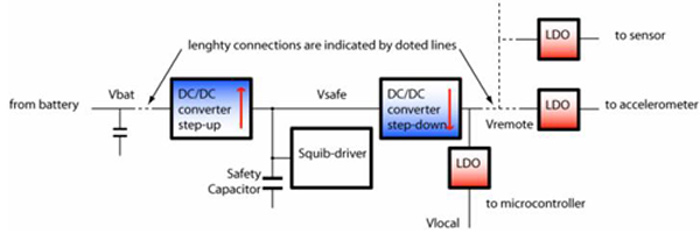 以下簡單介紹氣囊系統(tǒng)的充氣過程。氣囊系統(tǒng)設有升壓轉換器,一般來說,這些升壓轉換器都采用 sepic拓撲(sepic拓撲要求電路中采用兩個電感) 或回掃拓撲結構(回掃拓撲中需要采用一個變壓器)。進行充氣之前,氣囊系統(tǒng)的升壓轉換器會先將電池電壓(Vbat)提高(這個電池電壓在負載突降時可高達 40伏),直至達到安全電壓(Vsafe)要求的電平,這樣可確保安全電容器儲存大量電能(見圖2)。之后才將這個較高的安全電壓調低至幾伏,這個較低的電壓稱為遠程電壓(Vremote)。必須嚴格按照這個充氣準備程序,以確保其后幾級的低壓降穩(wěn)壓器出現(xiàn)較少壓降。壓降越少,功耗也就越低,效率也就越高。