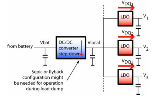 我們?nèi)舨捎瞄_關穩(wěn)壓器作為輸入級,再以多個低壓降穩(wěn)壓器提供輸出,便可降低電源系統(tǒng)的整體成本。高功率的電源系統(tǒng)甚至必須采用這樣的設計。圖4是其中一個示例。