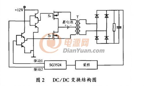 由于變壓器原邊電壓比較低,為了提高變壓器的利用率,降低成本,DC/DC變換如圖2所示,采用推挽式電路,原邊中心抽頭接蓄電池,兩端用開關管控制,交替工作,可以提高轉換效率。而推挽式電路用的開關器件少,雙端工作的變壓器的體積比較小,可提高占空比,增大輸出功率。