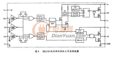 IR2110的內部結構和工作原理框圖如圖4所示。圖中HIN和LIN為逆變橋中同一橋臂上下兩個功率MOS的驅動脈沖信號輸入端。SD為保護信號輸入端,當該腳接高電平時,IR2110的輸出信號全被封鎖,其對應的輸出端恒為低電平;而當該腳接低電平時,IR2110的輸出信號跟隨HIN和LIN而變化,在實際電路里,該端接用戶的保護電路的輸出。HO和LO是兩路驅動信號輸出端,驅動同一橋臂的MOSFET