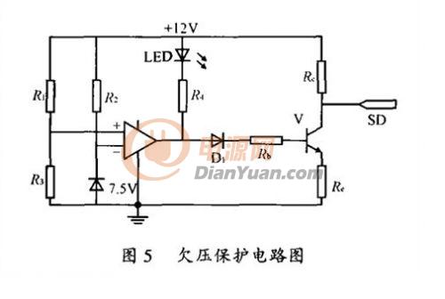 欠壓保護電路如圖5所示,它監測蓄電池的電壓狀況,如果蓄電池電壓低于預設的10.8V,保護電路開始工作,使控制器SG3524的腳10關斷端輸出高電平,停止驅動信號輸出。