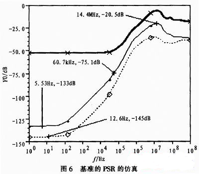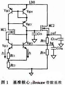 電子鎮(zhèn)流器的供電方式為半橋輸出接穩(wěn)壓管給芯片供電,其輸出電壓為高壓正弦波(50~100 kHz),加之芯片內(nèi)數(shù)字部分的干擾,這就給芯片的電源帶來較大的干擾。因此對芯片內(nèi)基準(zhǔn)的中頻PSR(Power Supply Rejection,電源抑制)有較大要求。本文從此角度在Brokaw帶隙基準(zhǔn)的基礎(chǔ)上進行改進,采用LDO與基準(zhǔn)的級聯(lián)設(shè)計來增加其PSR。
