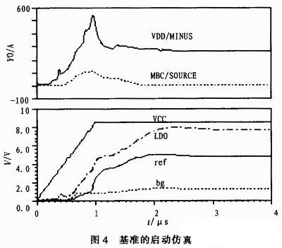 MBC控制作用的簡述:在1μs時流過100μA的啟動電流,當(dāng)LDO、ref、bg建立最低工作電壓后,啟動電路開始關(guān)斷過程,電流急劇減小,并最終在2μs時接近0A。整個電路正常運行時消耗的電流是266μA。