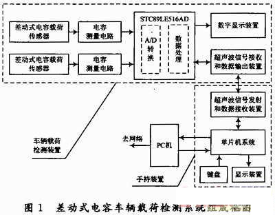 車輛載荷檢測裝置為便攜式,使用時鋪設在路面上。手持裝置為測量系統控制單元,通過無線通信方式對檢測裝置發出指令和接收數據。載荷檢測傳感器采用差動式電容載荷傳感器,傳感器將載荷的變化轉變為電容值的變化。電容測量電路采用獨特的差動脈沖寬度調制集成電路,將來自于差動式電容載荷傳感器的極其微弱的電容信號采集出來,并轉化成易于檢測的電壓信號。數據處理模塊采用內部自帶8路8位A/D轉換器的電壓輸入型STC89LE516AD單片機芯片。數據處理模塊對信號進行A/D轉換、數據采集、數據處理,之后,將處理后的載荷結果輸出。為了減少線路鋪設的麻煩,增加工作人員的安全性,檢測系統的數據通信采用無線通信裝置。