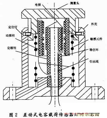 差動式電容載荷傳感器結構示意圖如圖2所示。它主要由測量頭、外殼、敏感元件(彈性體)、定極柱、動極柱、電極、等位環、引出線等構成。其特點為:測量范圍寬;靈敏度高,便于拾取信號;極板間不接觸、不變形、不磨損,機械損失小、壽命長;電容傳感器受溫度影響小;動態性能好;結構簡單、適應各種惡劣環境和場合。