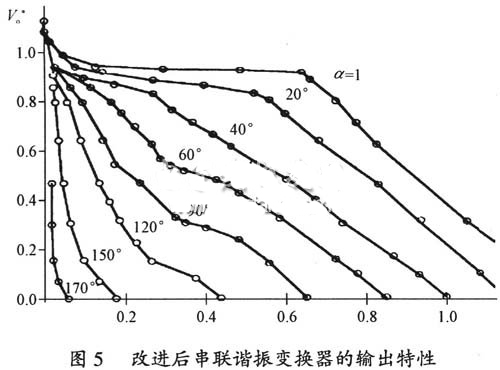 圖4中最大的功率曲線(α=1)即對應于變換器開環工作,圖4中停留在底部的曲線是對應于輕載的情況。工作在歸一化的輸出電流I*o=0.15%且ψ=1時,結果產生大約30%的過壓。改進變換器的輸出特性為雙斜率輸出特性,使電路提高了電壓、電流限制的固有能力,改善了高壓電源的空、滿載的適應性,同時有利于高壓電源寬范圍的輸出調節。