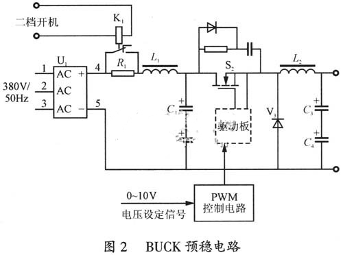 三相交流配電經整流濾波電路之后,形成500V左右的直流電壓加在。BUCK預穩電路的輸入端。其中K1為抑制合閘浪涌電壓而設置的,其二檔吸合信號由電源控顯電路給出。S2為BUCK功率開關管,其工作脈沖由PWM控制電路給出,為了保證電源具有足夠的動態特性,該功率開關管工作頻率為100kHz左右。PWM控制器輸出脈沖寬度,由電壓設定信號給出。當電壓設定信號由0~10V變換時,PWM控制器輸出的脈沖占空比在0~0.85的范圍內變化。L2為儲能電感,由于BUCK電路的占空比在0~0.85大范圍變化,為了保證電路起到預穩作用,需要避免輸出電流斷續,同時不至于設計余量過大,采用了額定負載條件下的計算值,實際工作情況良好。