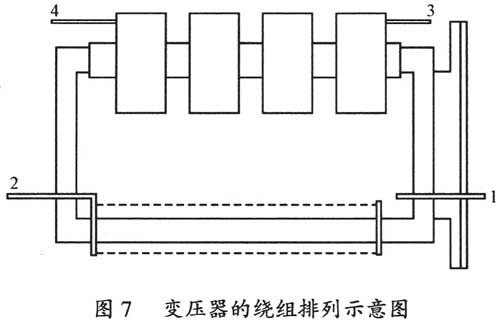 為了減少高壓繞組和低壓繞組之間的分布電容,確保高壓繞組和低壓繞組之間的絕緣,需要將原邊繞組繞制在矩形鐵心的一邊,副邊繞組繞制在矩形鐵心的另一邊,并留足原、副邊間的距離,最后用環氧樹脂灌注作為主絕緣。