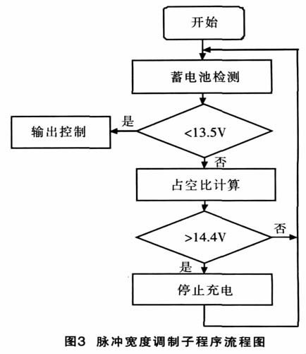 脈寬調制子程序完成太陽電池向蓄電池以脈寬調制的方式充電,控制器根據蓄電池的荷電狀態(tài)來控制白天太陽電池向蓄電池充電,其目的是為了改善充電效果和保護蓄電池,防止蓄電池過充。