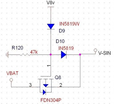 第一種應(yīng)用,由PMOS來進(jìn)行電壓的選擇,當(dāng)V8V存在時,此時電壓全部由V8V提供,將PMOS關(guān)閉,VBAT不提供電壓給VSIN,而當(dāng)V8V為低時,VSIN由8V供電。注意R120的接地,該電阻能將柵極電壓穩(wěn)定地拉低,確保PMOS的正常開啟,這也是前文所描述的柵極高阻抗所帶來的狀態(tài)隱患。D9和D10的作用在于防止電壓的倒灌。D9可以省略。這里要注意到實際上該電路的DS接反,這樣由附生二極管導(dǎo)通導(dǎo)致了開關(guān)管的功能不能達(dá)到,實際應(yīng)用要注意。