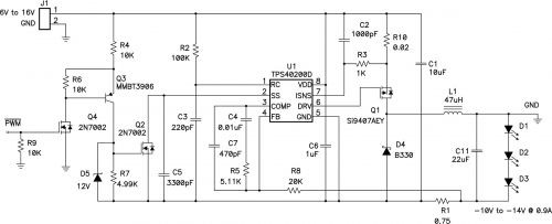 LED 電流的調節是透過感應感測電阻 R1 兩端的電壓并將其用作控制電路的反饋。控制器接地接腳必須為負輸出電壓的參考電壓,以便讓該直接反饋正常運作。如果控制器為系統接地的參考電壓,則需要一個電平移位電路。這種"負接地"對電路構成了一些限制。功率 MOSFET、二極體和控制器的額定電壓必須高於輸入與輸出電壓的總和。