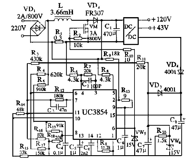 圖4 UC3854 構成PFC 電路的大屏幕彩電開關電源原理圖[page]