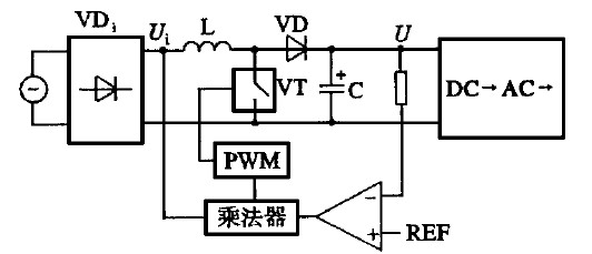高頻有源PFC 是根據電網的電壓、電流及負載的變化產生PWM 信號, 控制高頻電子開關導通的, 可起調節電感L 的作用。改善電流波形, 利用乘法器控制PWM 信號, 可使電網的輸入電流基本為正弦波, 使λ接近于1( 即大于0. 99) 。圖1 示出PFC 的原理框圖。