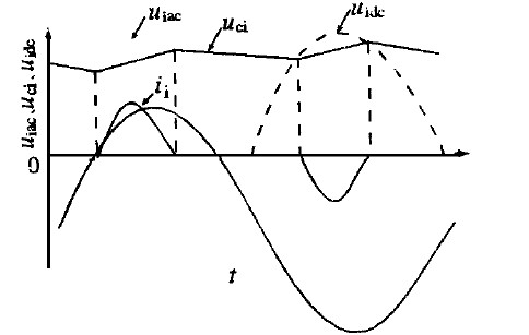 圖中,uiac為電網電壓波形;uidc 為經V1 整流出的波形;uci 為輸入濾波電解電容的電壓波形;i i 為輸入電流波形。