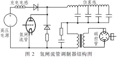 以氫閘流管ZQM1-350/14型為例,其參數為14 000 V/350 A,陶瓷外殼,需要12.6 V/6 A的燈絲電源。其關斷時,高壓電源經充電電感和變壓器的原邊給仿真線充電,氫閘流管接通時,仿真線經氫閘流管對變壓器原邊放電,在變壓器的副邊產生高壓脈沖去調制磁控管。氫閘流調制器的結構如圖2所示。