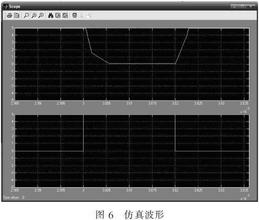 設觸發脈沖周期為2 ms,脈沖寬度為2μs,如圖6中的第一示波器(圖的下部),仿真線前端的波形如圖6中的第二示波器(圖的上部)。由第二示波器可見,當觸發脈沖到來時,即IGBT網絡導通時,仿真線迅速放電,放電速率為5 000 V/6μs(即從滿電壓5 000 V至放電完成時間約為6μs),并且無反沖。當觸發脈沖過去時,即IGBT網絡斷開時,仿真線迅速充電,放電速率為5 000 V/3μs(即從充電開始至滿電壓5 000 V的時間約為3μs),并且無反沖。
