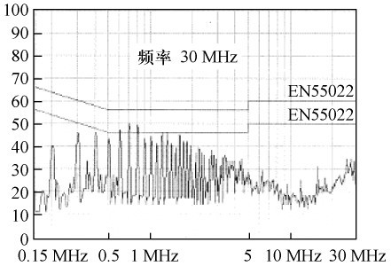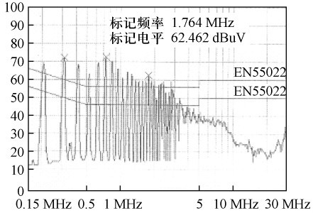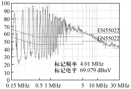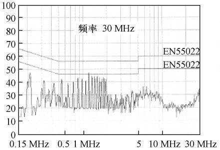 根據圖3 所示的結構。繞制變壓器,并在交流整流濾波后增設13 mH 差模濾波電感和6. 8差模濾波電容,對開關電源進行傳導EMI 測試,結果如圖6 所示。由圖6 可見,傳導EMI 非常嚴重,不能通過電磁干擾測試。在交流整流前增設35 mH 共模濾波電感,傳導EMI 測試結果如圖7 所示,產品即可通過測試。比較測試結果可得出:在圖3 所示的電路中,主要是由于大量共模傳導EMI,才使電源不能通過電磁干擾測試。