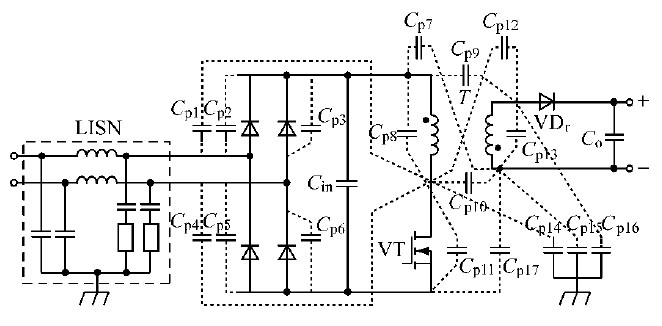在圖1 所示的反激式開關電源中,變換器工作于連續模式時,開關管VT 導通后,B 點電位低于A 點,一次繞組匝間電容便會充電,充電電流由A 流向B;VT 關斷后,寄生電容反向充電,充電電流由B 流向A。這樣,變壓器中便產生了差模傳導EMI。同時,電源元器件與大地之間的電位差也會產生高頻變化。由于元器件與大地、機殼之間存在著分布電容,便產生了在輸入端與大地、機殼所構成回路之間流動的共模傳導EMI 電流。