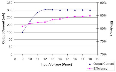 在電路配置方面,VBAT的額定電壓為-0.3至+40 V,因此整流橋上的輸入電壓高達24 Vac也是安全的。要保持較高輸入電壓水平就需要一個大容量的C1。大幅波動的經整流的AC電流將在雙倍AC線路頻率條件下把輸出電流拉至零,因此減少了輸出電流。220 μF的電容對這個設計已經足夠了。對于12 Vac輸入,C1額定電壓應該是25 V。由于需要較低的正向電壓,整流橋選用了MBR0520L表面貼裝肖特基二極管。
