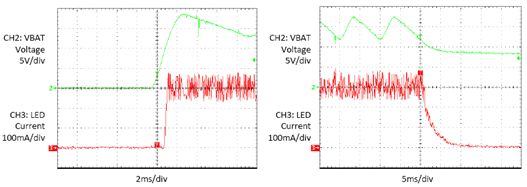 輸出電容C2建議至少為4.7 μF,以減少輸出紋波。較大容量的C2將有效抑制輸出紋波,同時可提高幾毫安的輸出電流。不過,由于其對總能效的貢獻微不足道,且人眼無法感知高頻波動,沒有必要使用大于10 μF的電容。L的值建議為22 μH,以將開關頻率設置在約為150 kHz。LED電流范圍為0至350 mA,所以800 mA左右的電感有效額定電流就足夠了。