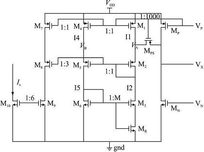 圖2所示電流檢測電路中, MP、MN 為功率管,M1 與M4、M2 與M5 的W/L相同, VP 為MP 的控制信號, MPS用作開關, 其W/L比較大, 具有低導通電阻。在電流模DC /DC 轉換器中, 反饋控制環路只需檢測MP 功率管導通時的電流, 因此, 為降低功耗, 可控制電流檢測電路只在MP 功率管導通時工作, 即只檢測電感充電階段的電流, 而在MP 功率管截止時, 電流檢測電路不工作, 進而有效地減小了功率損耗。