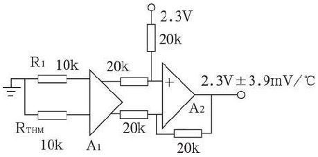 UC3909 內部集成了具有鉛酸蓄電池溫度補償功能的電路如圖4 所示, A1 為電流/ 電壓轉換元件, 其輸入端分別接10 kΩ 普通電阻及10 k Ω 熱敏電阻。A2 與外接四個20 kΩ 電阻組成差動運算放大電路。RT HM 一般貼附在鉛酸蓄電池的表面殼體用于檢測其溫度, 當鉛酸蓄電池內部溫度變化時, 通過熱敏電阻RTHM 的反饋使U C3909 的基準電壓2. 3 V 也隨溫度按- 3. 9 mV/℃ 的溫度系數變化。從而確保鉛酸蓄電池在浮充狀態下準確工作于安全的浮充電壓, 保護了鉛酸蓄電池。