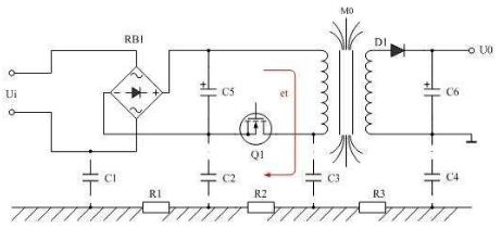 值得一提的是,開關電源變壓器初級線圈的漏感產生的反電動勢et,在所有干擾信號之中是最不容忽視的,如圖3所示。當電源開關管關斷的時候,開關電源變壓器初級線圈的漏感產生的反電動勢et幾乎沒有回路可釋放,一方面,它只能通過初級線圈的分布電容進行充電,并讓初級線圈的分布電容與漏感產生并聯(lián)諧振;另一方面,它只能通過輻射向外進行釋放,其中通過對地電容C3與大地相連,也是反電動勢et釋放能量的一個回路,因此,它對輸入端也會產生共模信號干擾。