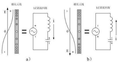 天線來回極化的工作原理可以等效成一個串聯(lián)諧振電路,當天線在電場力的作用下被極化帶電時,它又相當于一個電容在充電;當天線中的載流子在電場力的作用下來回移動時,它又相當于一個電感,并且在天線的周圍會產生磁場。