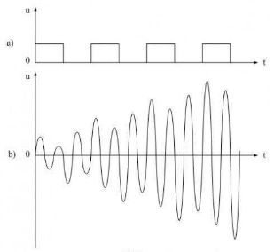 圖6是諧振回路產生諧振的工作原理圖。圖6-a)是一個含有諧波分量非常豐富的電壓方波,圖6-b)是LC串聯(lián)回路產生諧振時的電壓波形。當電壓方波作用于LC串聯(lián)回路時,方波的前后沿都會對LC串聯(lián)回路產生激勵(即接收能量),每次激勵過后又會產生阻尼振蕩(即損耗能量),當輸入電壓波形的上升率dv/dt值大于諧振回路波形(正弦波)的上升率時,電路就會產生激勵;當輸入電壓波形的上升率dv/dt值小于諧振回路波形的上升率時,電路就會產生阻尼。