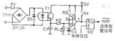 一個實用的掉電檢測電路如圖10所示。220 V交流電流經橋式整流后驅動光電隔離管T1(TLP521)中的發光二極管發光,并使T1的光電三極管導通,給電容C1充電。C1上的電壓經過R2,Rw分壓后送到比較器U1(LM393)正極性輸入端。當交流電正常工作時,調節電位器Rw使U1的“+”輸入端的電壓比“-”輸入端(穩壓管Dz的值)略高0.2 V左右,則U1輸出高電平,觸發器不翻轉,其Q端輸出高電平。當交流掉電時,C1不能被充電其電壓將很快下降。于是,比較器U1輸出低電平,觸發RS觸發器U2翻轉,產生非屏蔽中斷申請信號。如果在非屏蔽中斷服務程序中,把有危險的控制機構調到其安全的位置,并且保存當前運行的重要數據和寄存器的狀態,這就完成了掉電處理。通常,由于直流開關電源具有較大的輸入電容器,因此從檢測到交流掉電起,到直流失電計算機不能工作時為止,還有10 ms以上的時間,足夠完成掉電處理操作。