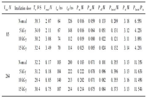 從表2中可以看出, 在85 V 交流輸入電壓下,輻照之后的APT13003E 比未輻照的APT13003E 的關斷延時有了大幅的減小, 因此關斷損耗大幅的減小, 如輻照為10 kGy的管子的關斷損耗減小為未輻照管子的1 /6; 導通延時有所增加, 但增加的幅度較小, 導通損耗有較小的增加; 飽和壓降隨輻照劑量的增加而增加, 因此通態損耗隨輻照劑量的增加而增加。開通損耗、通態損耗的增加與關斷損耗的減小是一對矛盾, 因此必須選擇合適的輻照劑量, 才能使開關晶體管總的損耗最小。