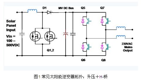 升壓+H-橋拓?fù)涫翘柲苣孀兤鳂O為常用的拓?fù)渲?,是一種兩級(jí)非隔離拓?fù)?。其第一?jí)是升壓級(jí),用于把模塊的可變輸出電壓(例如100V – 500V)升高到更大的中間電壓,后者必須大于實(shí)際峰值主線電壓(如230V x sqrt(2),或>325V)。該升壓級(jí)還有一個(gè)重要作用,就是為了實(shí)現(xiàn)效率最大化,太陽能模塊必須運(yùn)作產(chǎn)生盡可能大的功率,而太陽能模塊的功率 曲線可通過輸出電流乘以輸出電壓數(shù)值獲得。功率特性中有一個(gè)最大點(diǎn),被稱為“最大功率點(diǎn)”或MPP,而這精確位置會(huì)隨著模塊的類型、溫度和日照陰影等因素而變化。