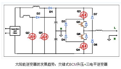 有很多方法能夠提高升壓逆變器的效率。由于升壓逆變器可在連續(xù)傳導(dǎo)模式或邊界傳導(dǎo)模式(CCM 或 BCM)下工作,這就衍生出不同的優(yōu)化方案。在CCM模式中,損耗的一大主因是升壓二極管的反向恢復(fù)電流;在這種情況下,一般使用碳化硅二極管或飛兆半導(dǎo)體的Stealth 二極管來解決。太陽能逆變器更常采用的是BCM模式,而盡管對這類功率級(jí)通常建議選擇CCM模式,但采用BCM模式的原因在于BCM模式中二極管的正向電 壓要低得多。而且,BCM模式也具有高得多的EMI濾波器和升壓電感紋波電流。這時(shí),良好的高頻電感設(shè)計(jì)是一解決方案。