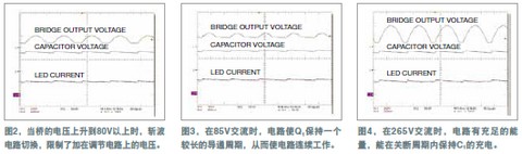 圖2顯示了在輸入電壓為150V 交流時,不同周期部分的電壓。軌跡1是橋式整流電路的輸出。軌跡2是C1上的電壓,即斬波電路的輸出。軌跡3是電流檢測電阻上的電壓。這些軌跡清楚地表明,當橋的輸出電壓增加到80V以上時,斬波電路切換,限制了加在調節電路上的電壓。圖3顯示了輸入電壓為85V交流時的電壓。