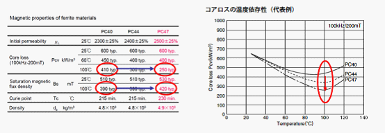 • PC47在100℃的磁芯損耗相比PC40降低了約40%