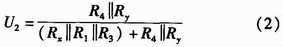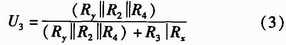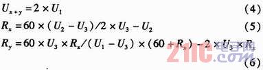 如圖2所示,U+和U-為被測線路的母線供電電壓,正常工作時兩母線間的電壓差Ux+y為440 V,且隨蓄電池內阻變化。Rx,Ry分別為被測線路的正母線絕緣電阻和負母線絕緣電阻。正、負母線絕緣電阻反映的是64路的正、負支路的總體絕緣性能,等效于各個支路的正、負絕緣電阻的并聯(lián),正常時兩母線絕緣電阻>20 kΩ。Ux和Uy為正負母線對地電壓,大小隨正負母線的絕緣電阻變化,但兩母線電壓差恒定為Ux+y。為了檢測正負母線電壓Ux,Uy,Rx,Ry,系統(tǒng)采用了“平衡-不平衡檢測法”檢測母線電壓和母線絕緣電阻。計算公式如式(1)所示。