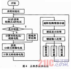 整個程序的編寫均由C語言完成,在程序設計中,采用了結構化程序設計方法,使各個模塊程序相對獨立,便于程序代碼的維護、移植和升級。同時,這樣分離式的程序設計,降低了代碼的調試難度,縮短了調試周期。將與接地故障信息(如母線電壓,母線絕緣電阻,支路絕緣電阻,接地支路號等)密切相關的數(shù)據放在一個結構體里,便于掉電存儲與回放顯示。系統(tǒng)的主程序流程圖,如圖4所示。